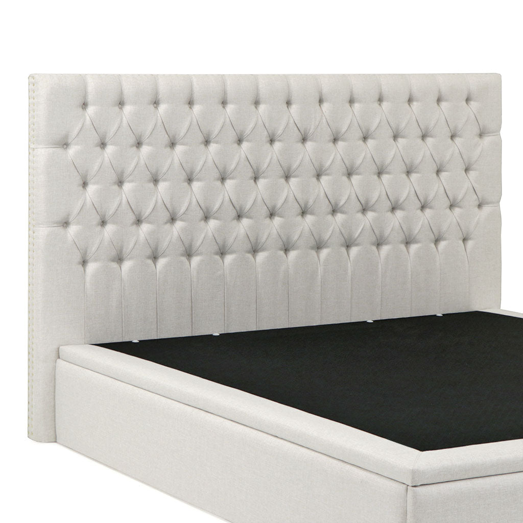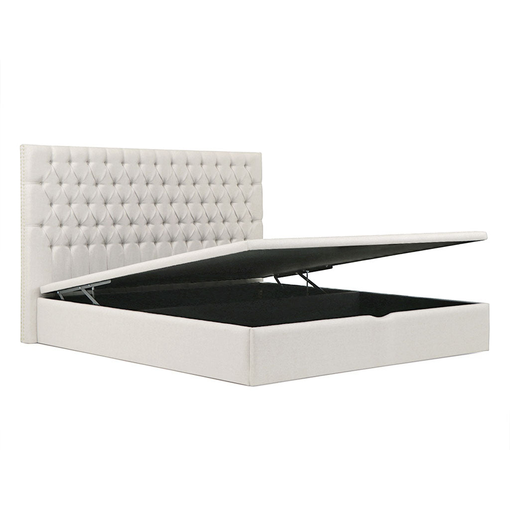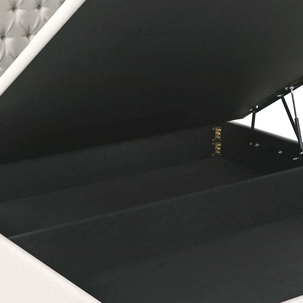 Camas com arrumação de tampo elevatório. Estrutura do sommier em madeira OSB3 ultra-resistente, forrado a tecido no interior e estrado de ripas. Cabeceira Aria, em capitone com pormenor de tachas. Espessura da cabeceira de 10cm (aproximadamente).. O sommier é dividido em 4 partes e o tampo é inteiro.