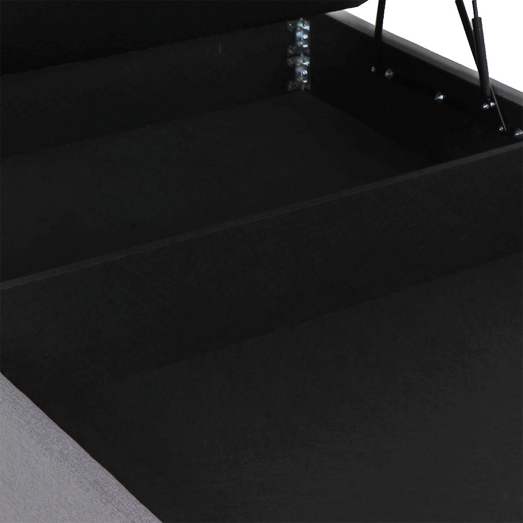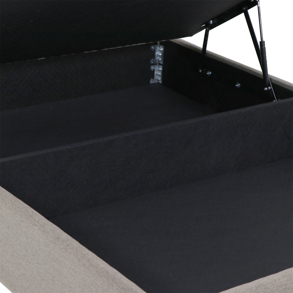 Com arrumação de tampo elevatório. Estrutura em aglomerado de madeira ultra-resistente, forrado a tecido no interior e estrado de ripas. O sommier, com altura de 32cm, é dividido em 4 partes e o estrado de tampo é inteiro.