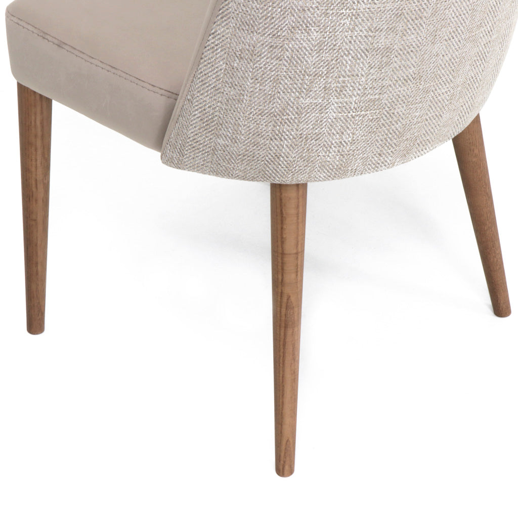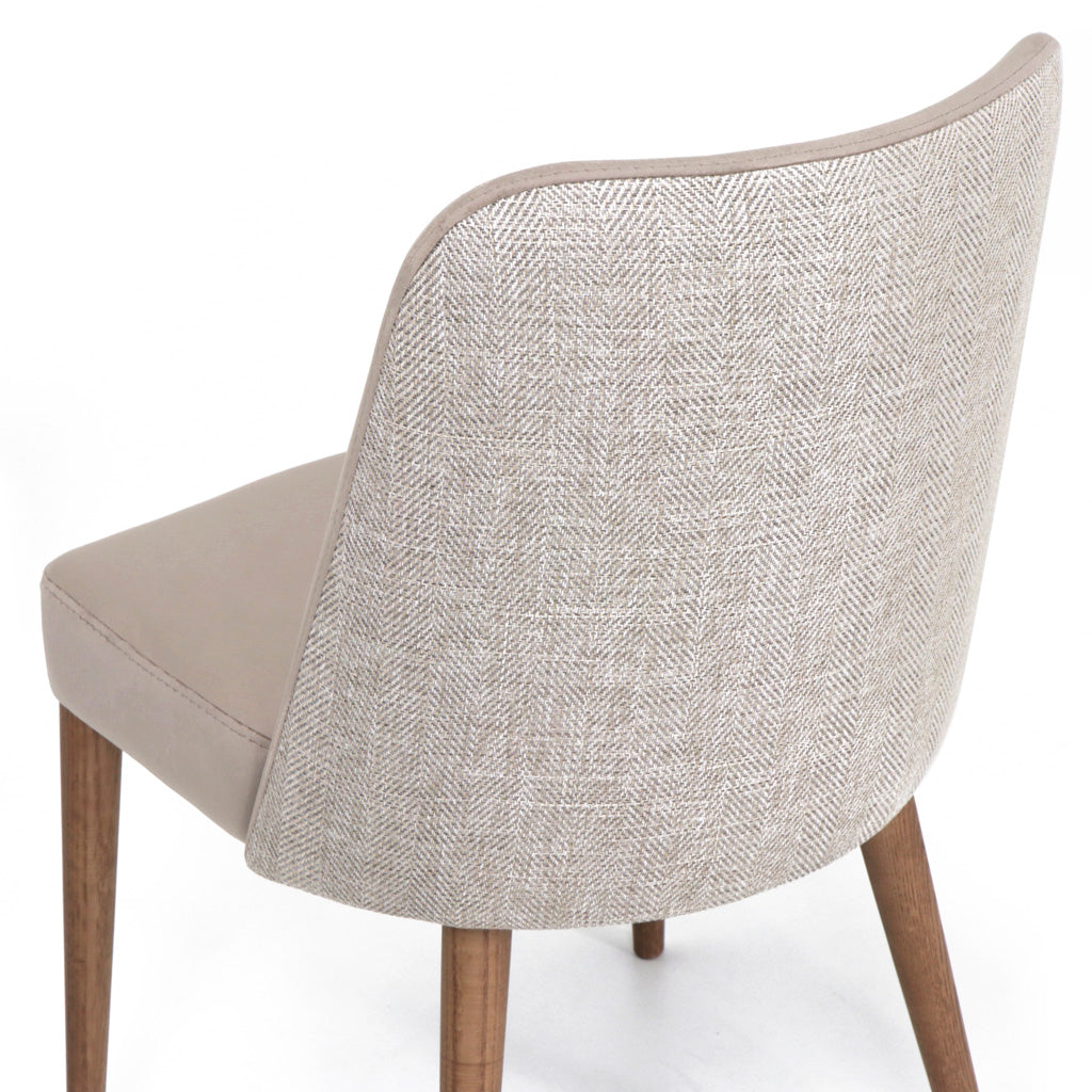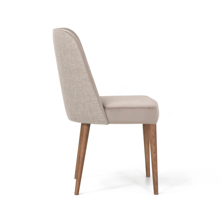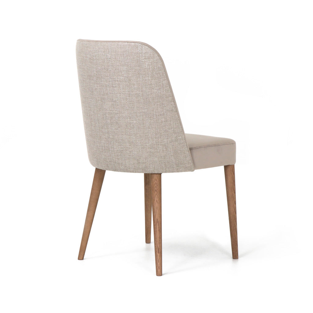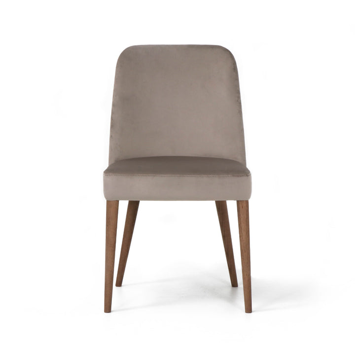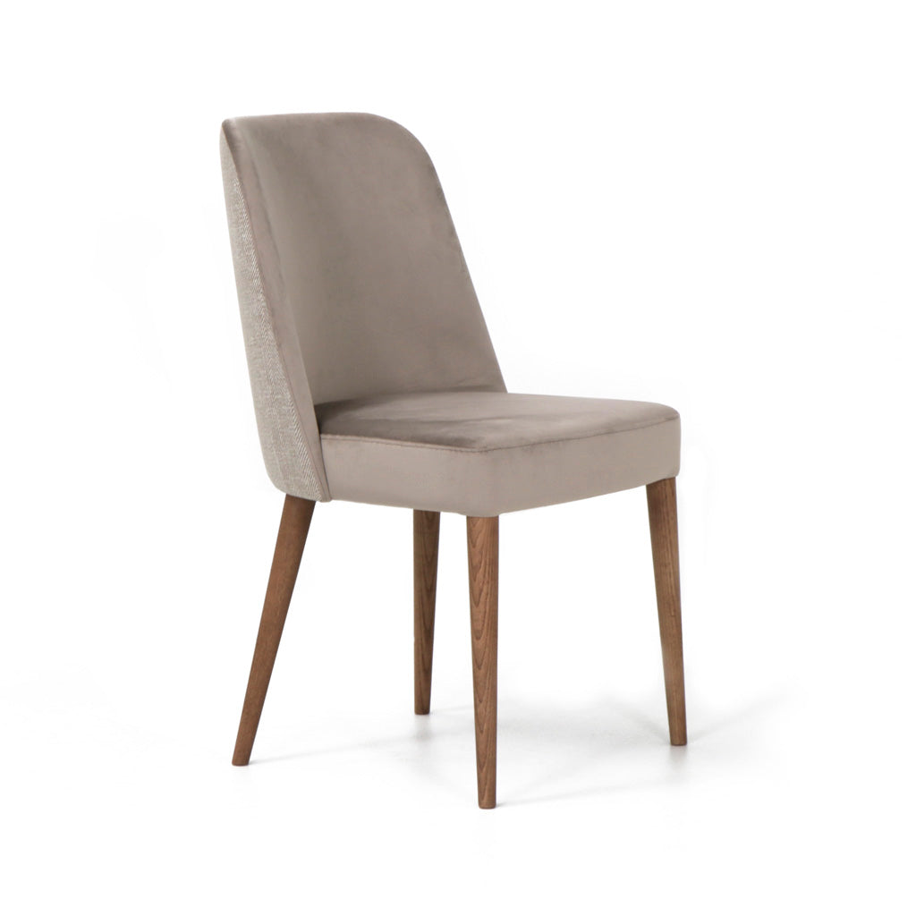 Cadeira Helena estofada com estrutura em madeira. Pés em Madeira de Freixo Maciço com Velatura Nogueira.