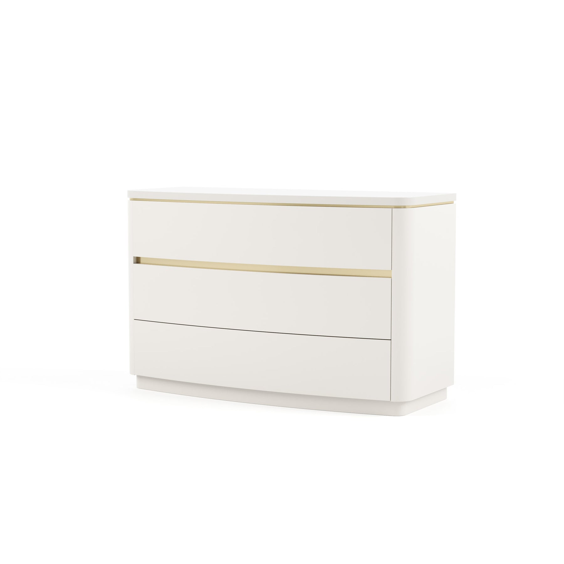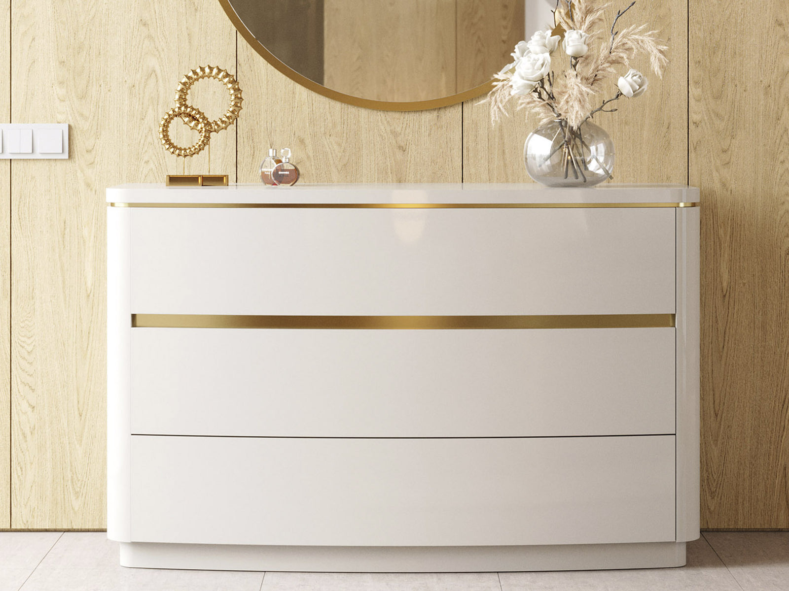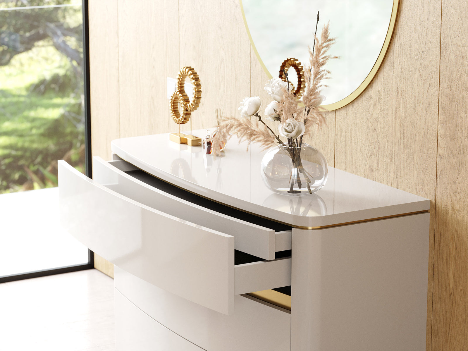 Cómoda em branco cetim com pormenores em dourado. Esta peça contém o espaço de arrumação que lhe faltava para a sua roupa, acessórios, revistas, entre outros.