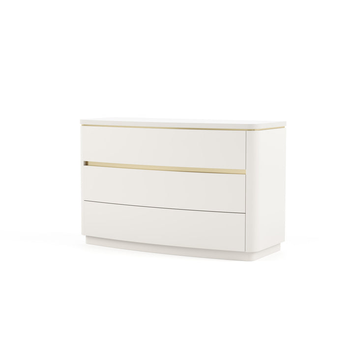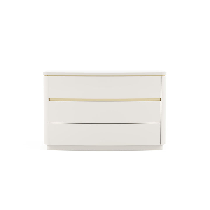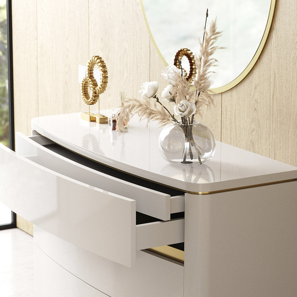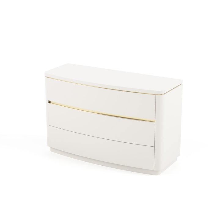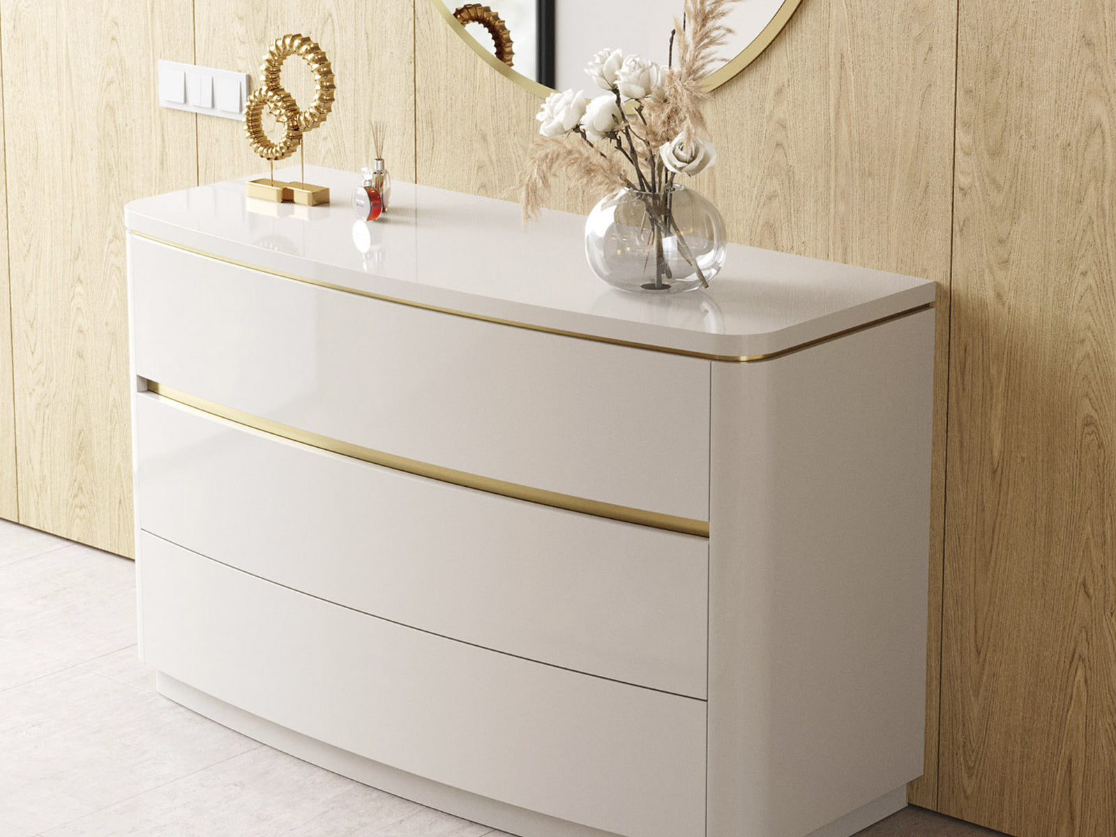 Cómoda em branco cetim com pormenores em dourado. Esta peça contém o espaço de arrumação que lhe faltava para a sua roupa, acessórios, revistas, entre outros.