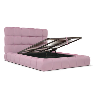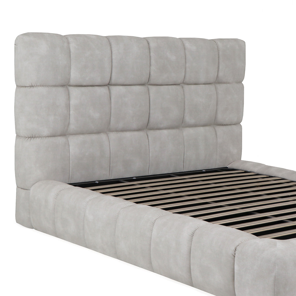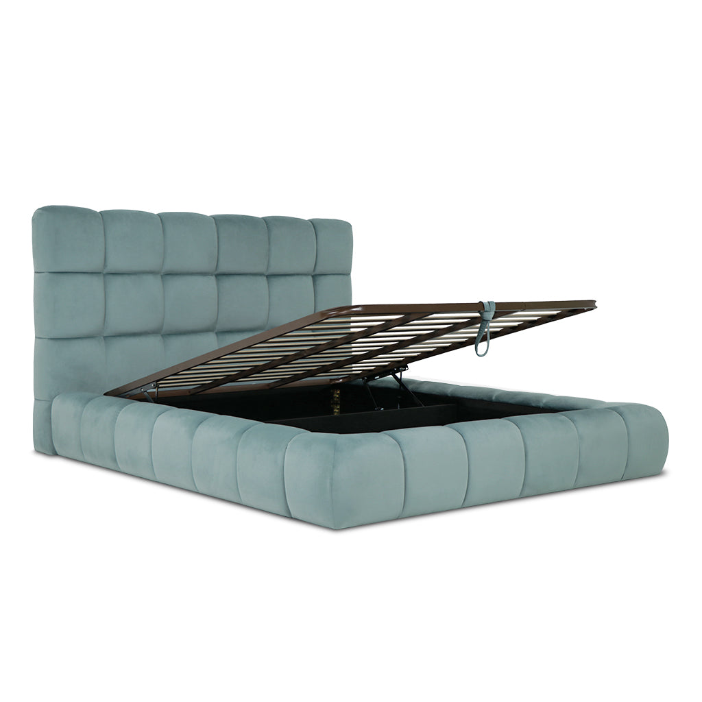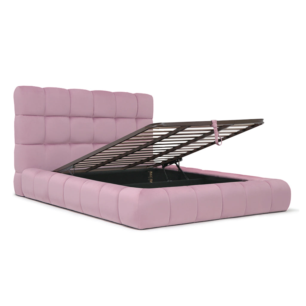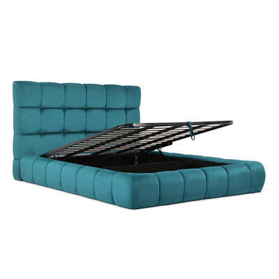 Cama Elite com estrado elevatório. Estrutura em madeira OSB3 ultra-resistente e estrado de ripas. Na parte exterior terá 40cm mais de largura e 40cm mais de comprimento do que a medida do estrado. O sommier é dividido em 4 partes e o estrado é inteiro. Inclui pés com 1cm. Este produto inclui apenas a cama (sommier + cabeceira).