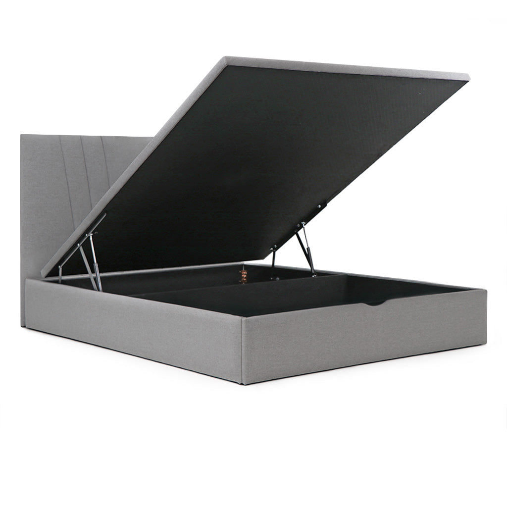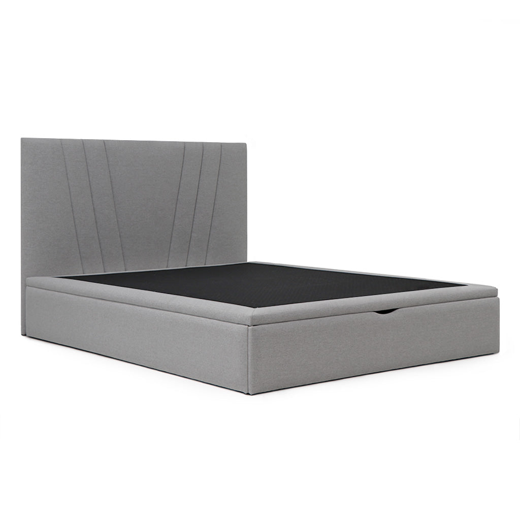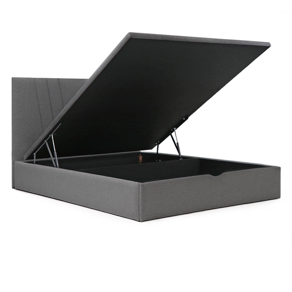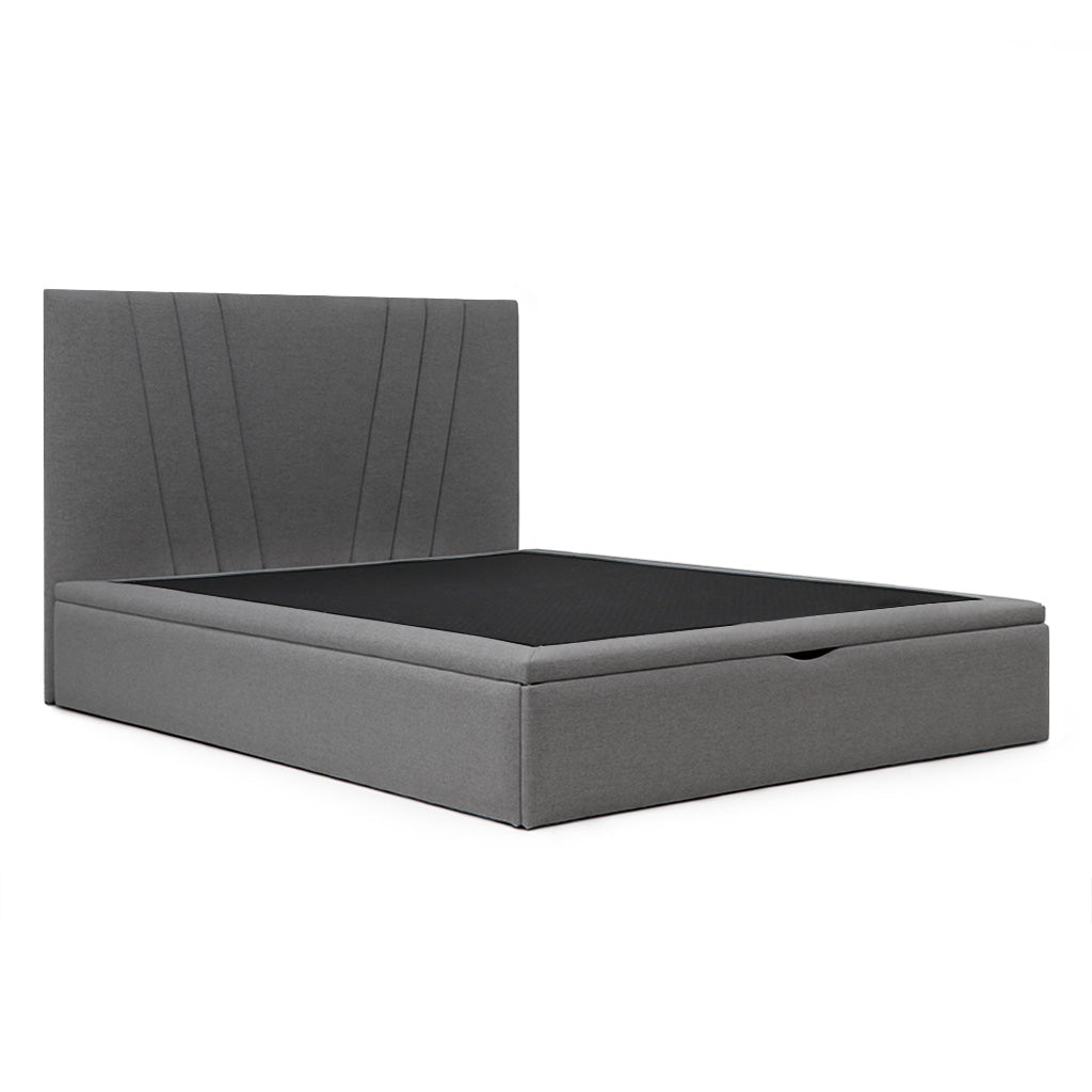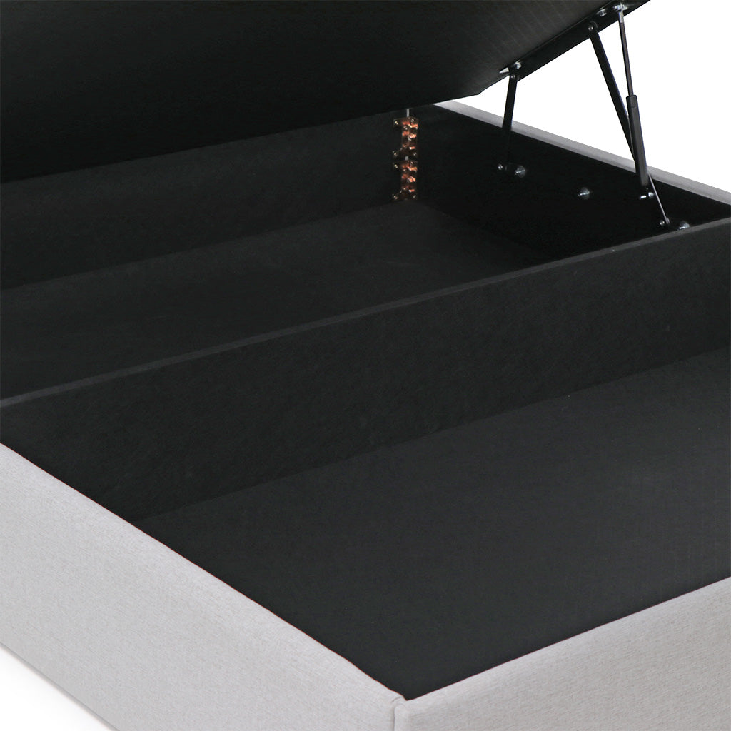 Somier pack with lifting top storage + eco bed headboard Maya, produced using completely suitable leftovers and ecological materials. Structure in ultra-resistant wood chipboard, foam and fabric. Headboard with horizontal sections and highlighted running stitching. The sommier is divided into 4 parts and the top platform, made of slats, is entire. All materials are certified.