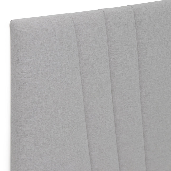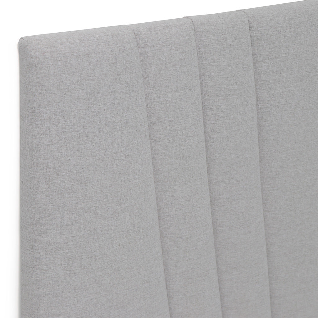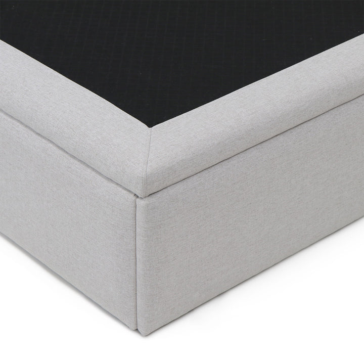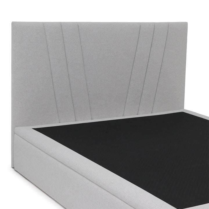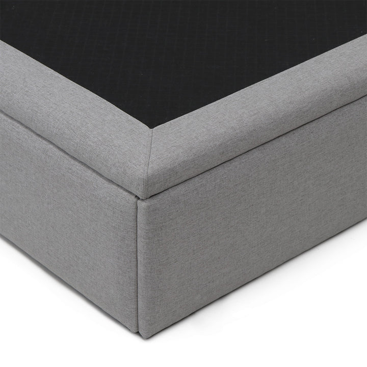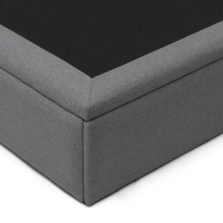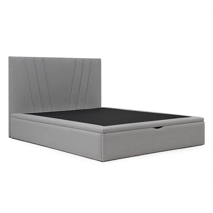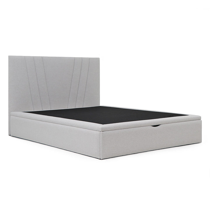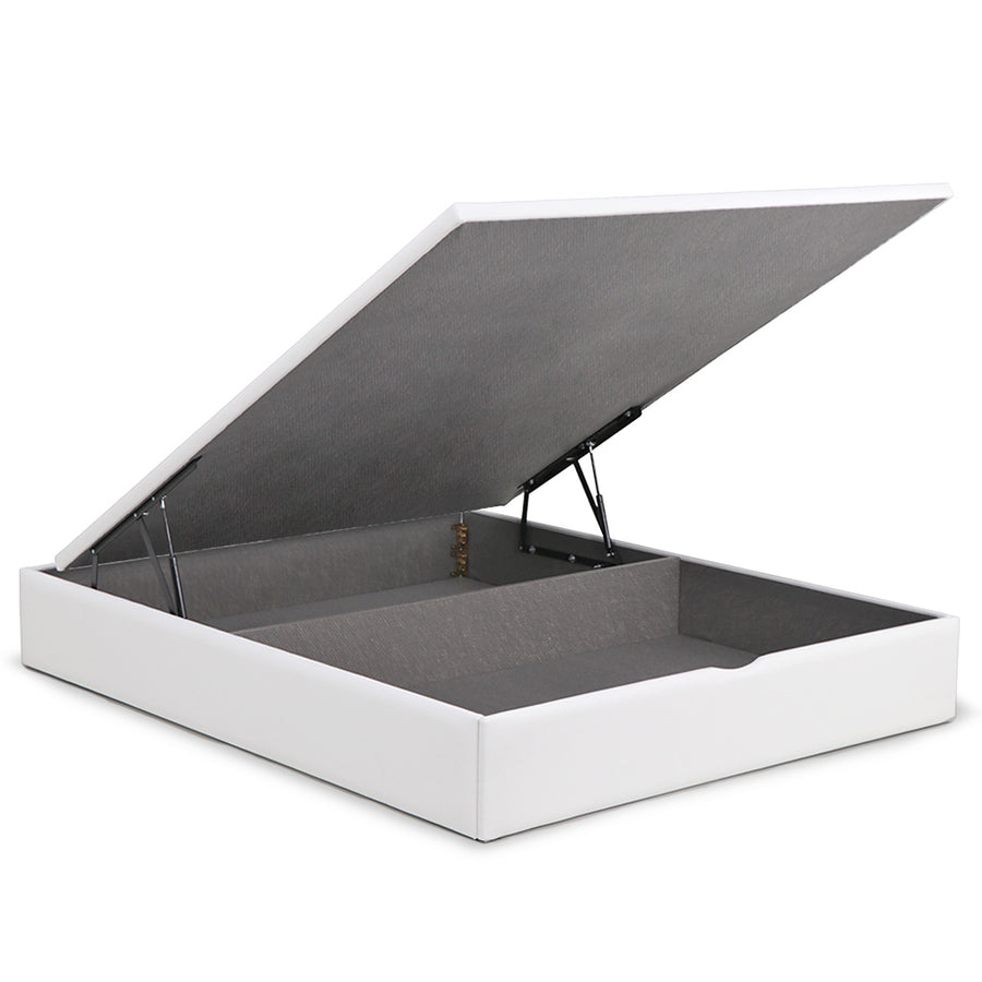 Somier pack with lifting top storage + eco bed headboard Maya, produced using completely suitable leftovers and ecological materials. Structure in ultra-resistant wood chipboard, foam and fabric. Headboard with horizontal sections and highlighted running stitching. The sommier is divided into 4 parts and the top platform, made of slats, is entire. All materials are certified.
