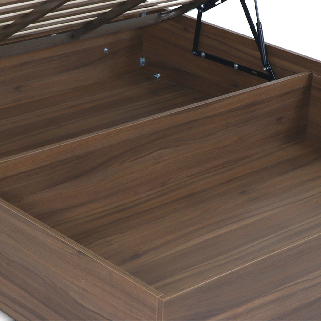 A estrutura é produzida em laminado resistente de Nogueira mate e/ou Carvalho. Assim, garantimos a durabilidade da cama sem comprometer a elegância. O sommier é dividido em 4 partes e o estrado é inteiro. Estrado incluído.