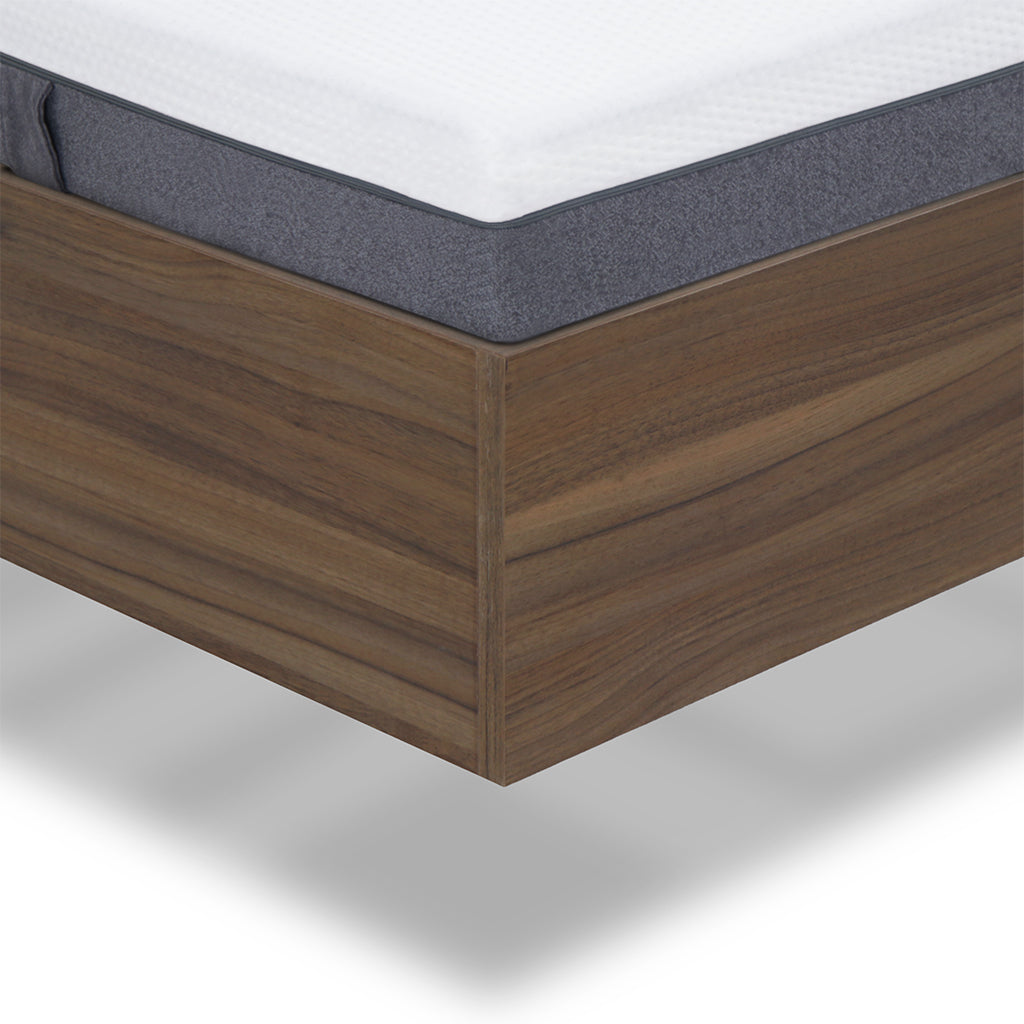 A estrutura é produzida em laminado resistente de Nogueira mate e/ou Carvalho. Assim, garantimos a durabilidade da cama sem comprometer a elegância. O sommier é dividido em 4 partes e o estrado é inteiro. Estrado incluído.