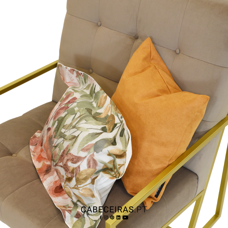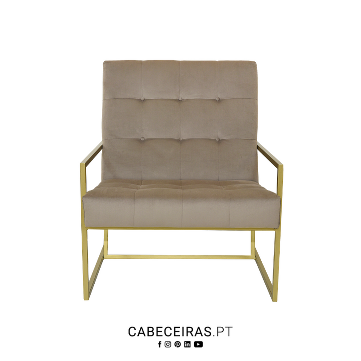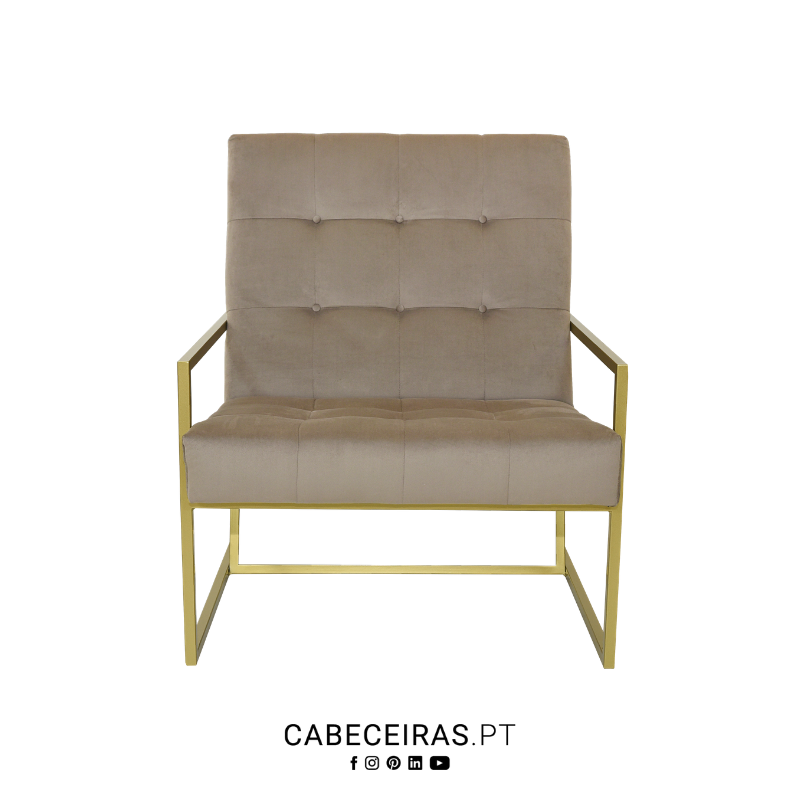 Elite armchair. Iron frame, painted in gold. Upholstery with tufted detail on the backrest and seat. This product does not include decorative cushions.