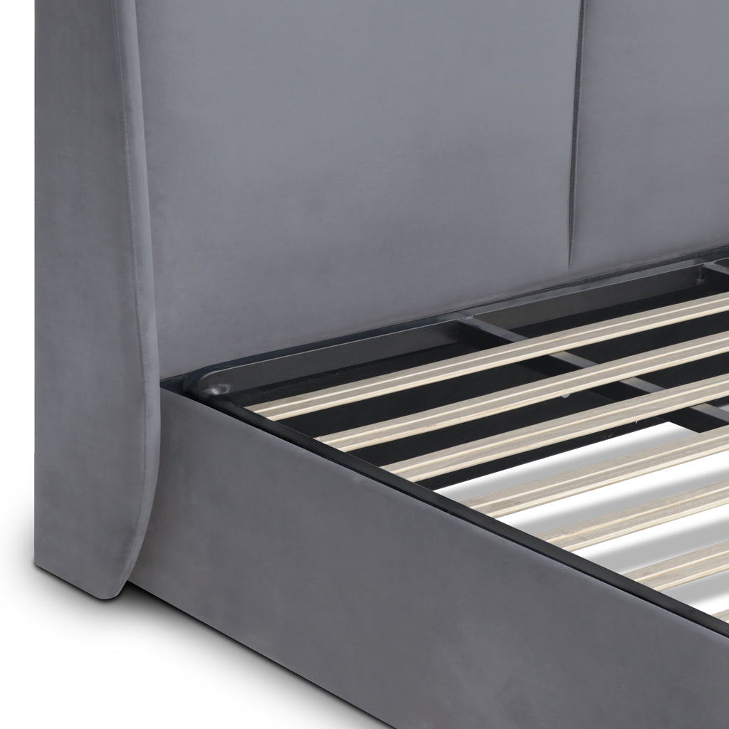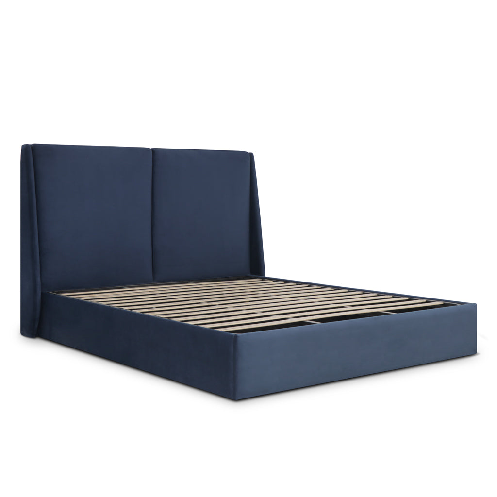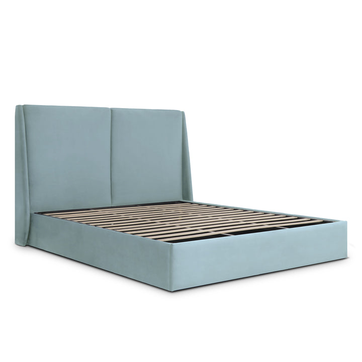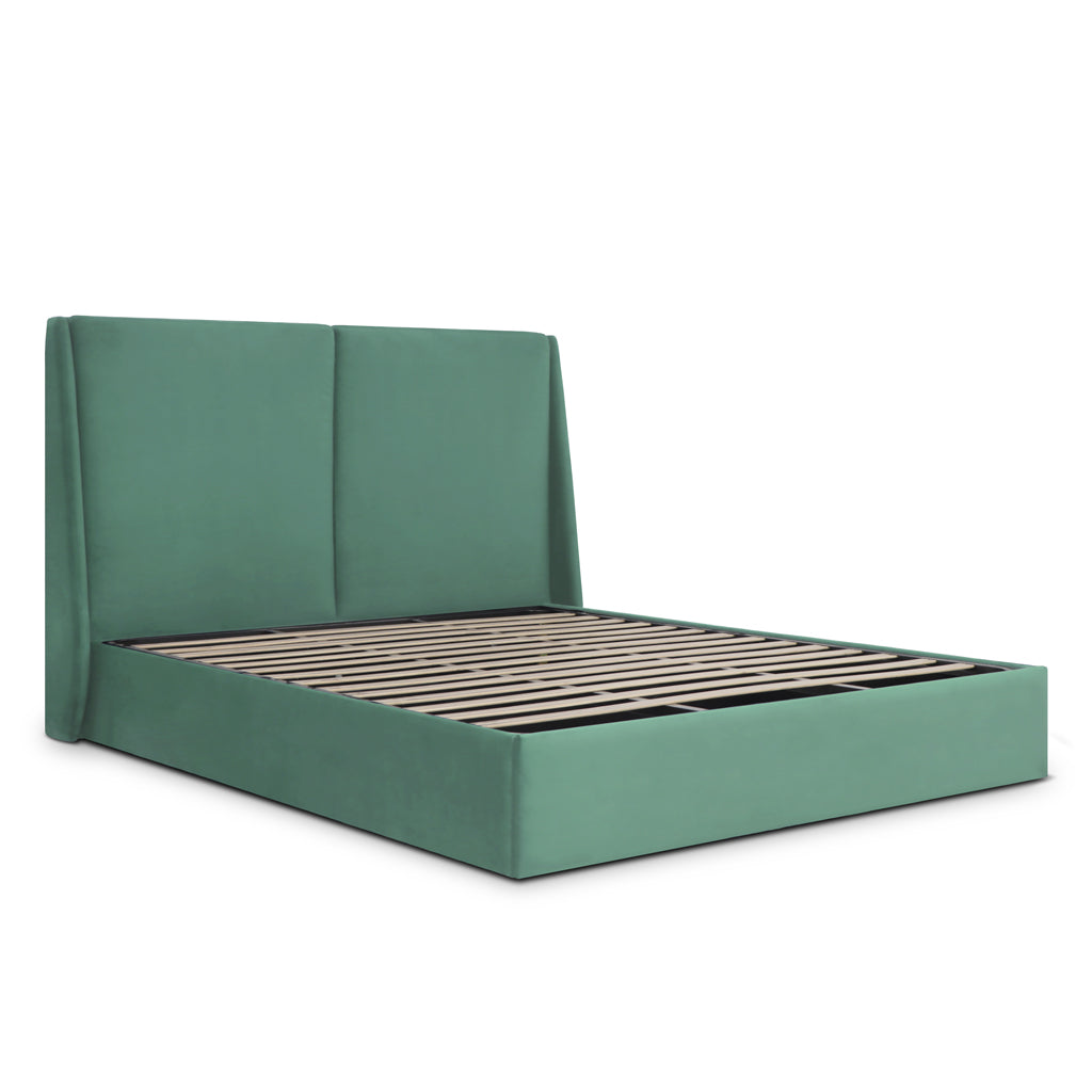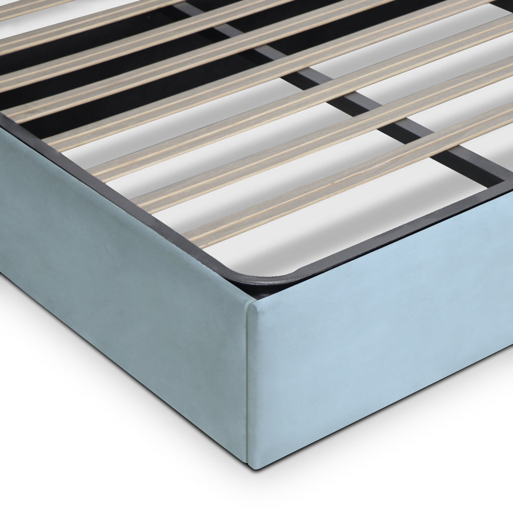 Amélia upholstered bed. Sommier frame in ultra-resistant plywood and chipboard. Headboard in chipboard, foam and fabric. The sommier is divided into 4 parts, 30cm high. This product only includes the bed (sommier + headboards).