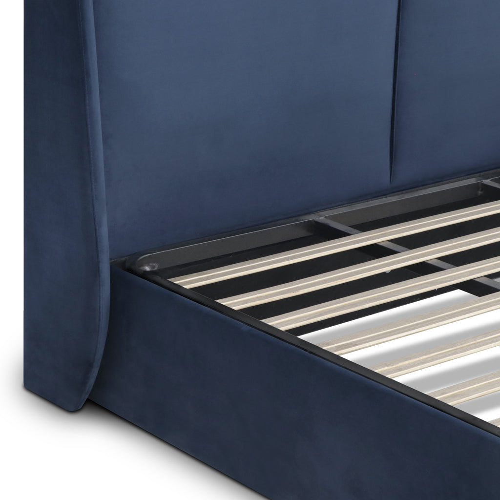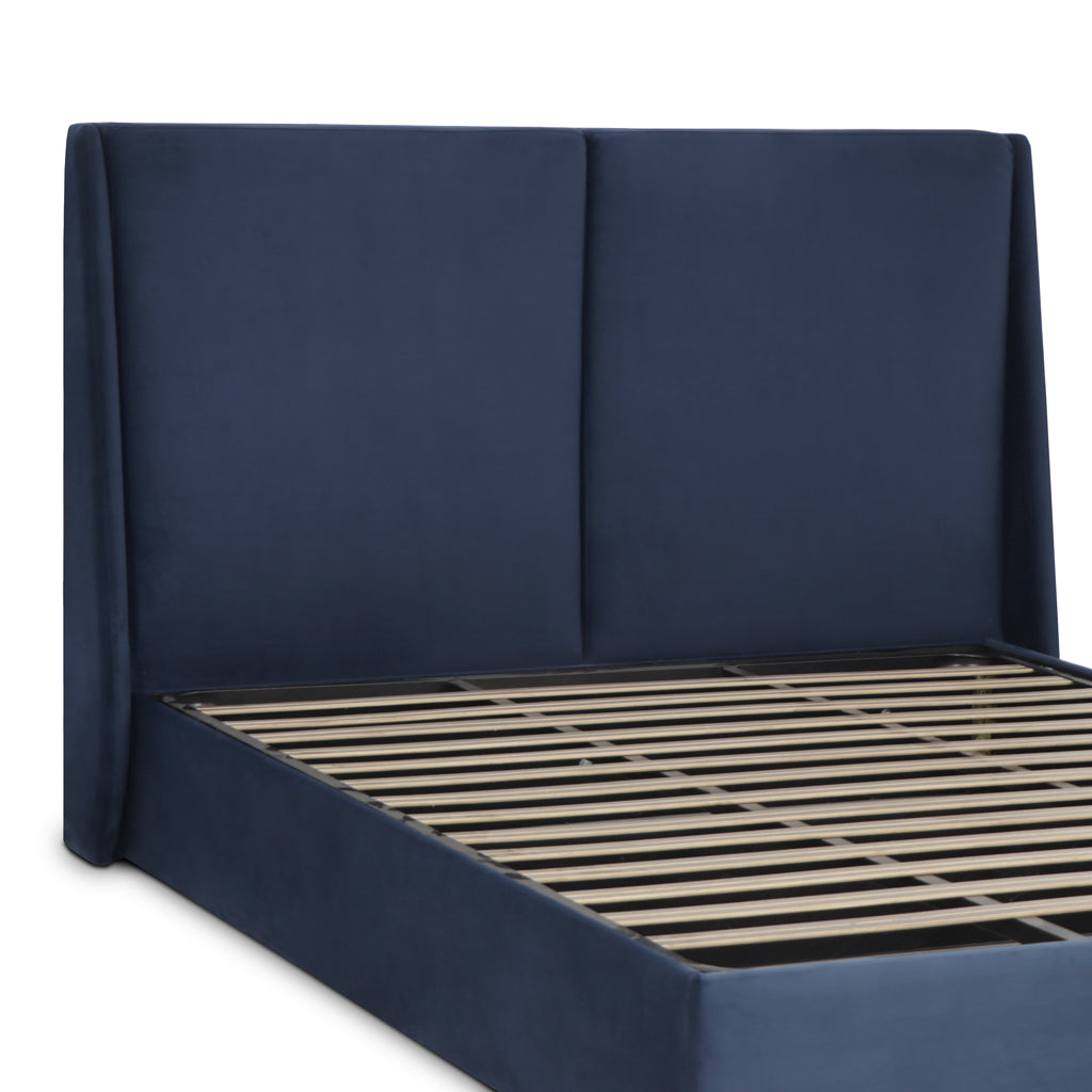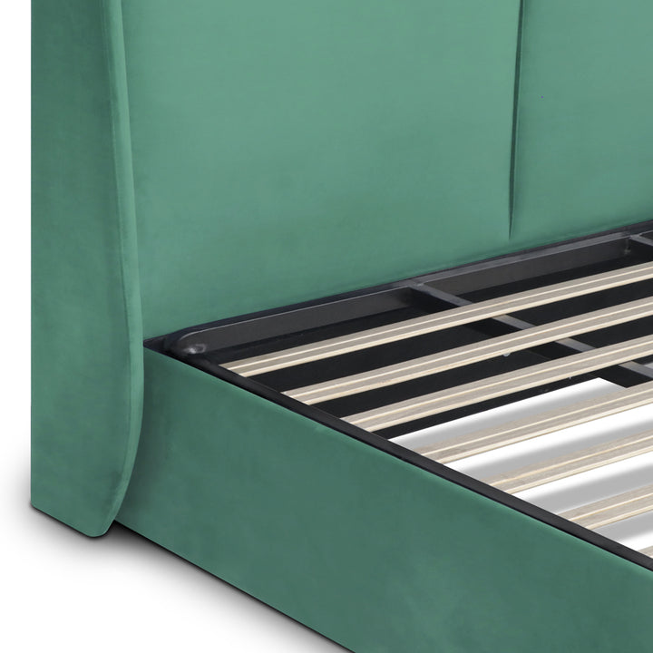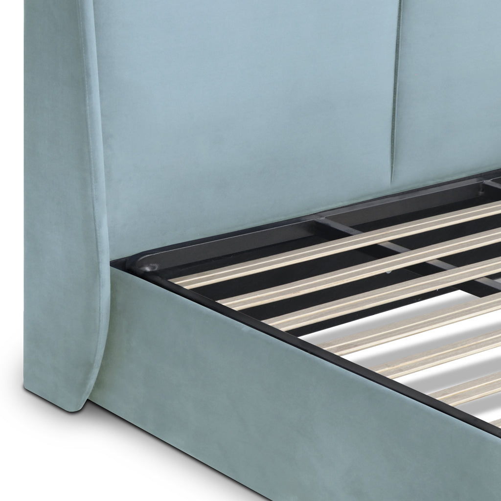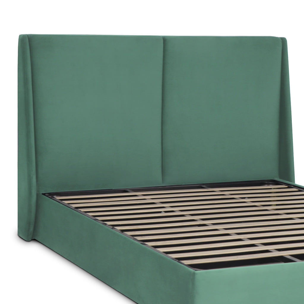 Amélia upholstered bed. Sommier frame in ultra-resistant plywood and chipboard. Headboard in chipboard, foam and fabric. The sommier is divided into 4 parts, 30cm high. This product only includes the bed (sommier + headboards).