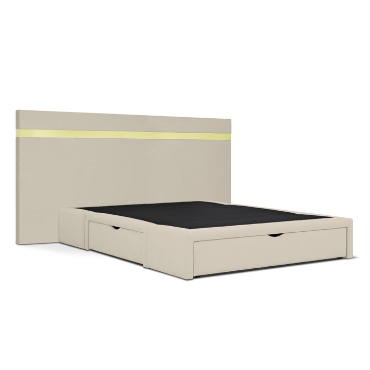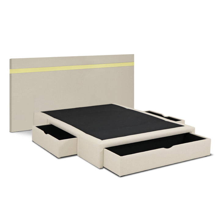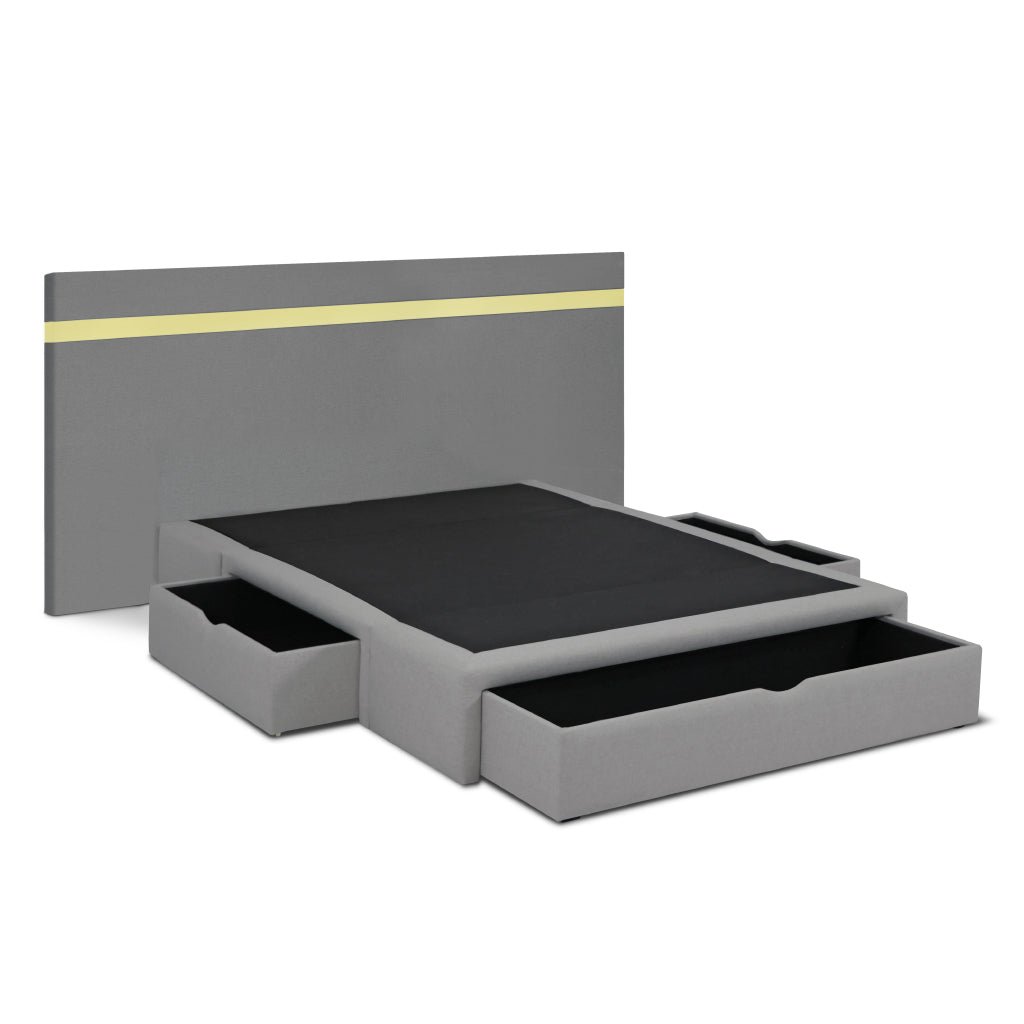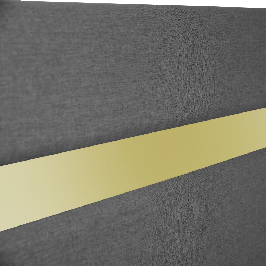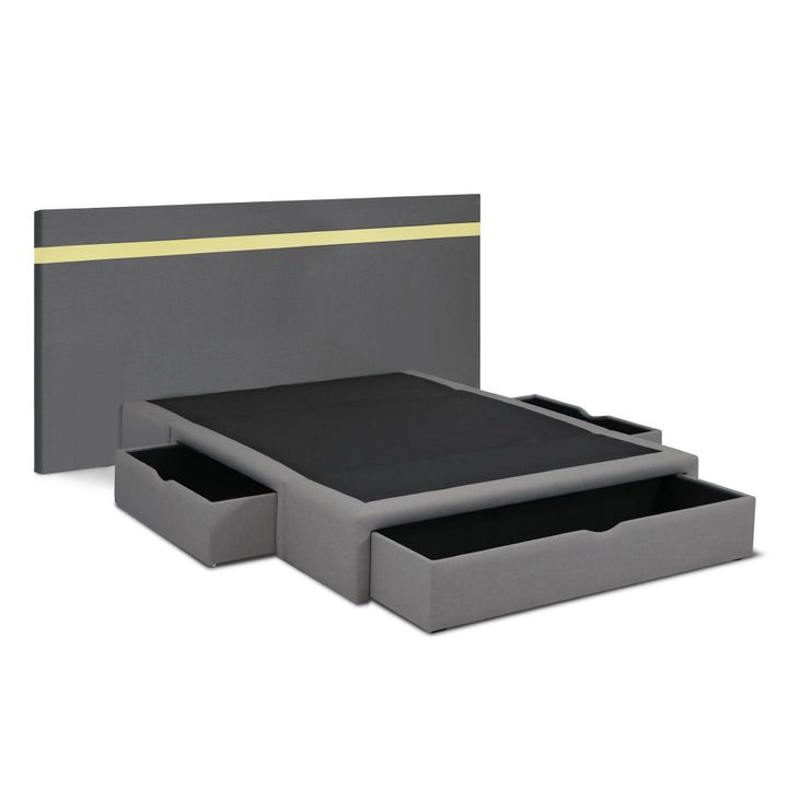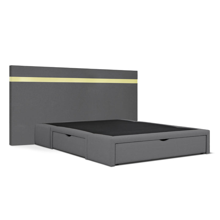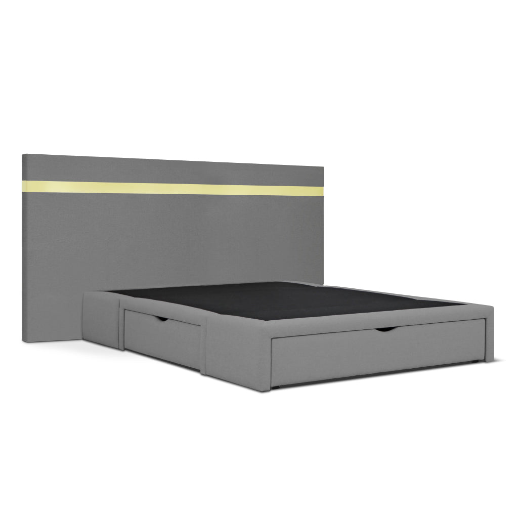 Bed with 3-drawer storage. Bed base frame in ultra-resistant plywood and chipboard. Headboard with gold-tone metal detailing without joints. The bed base is divided into 3 parts. This product only includes the bed (bed base + headboard).