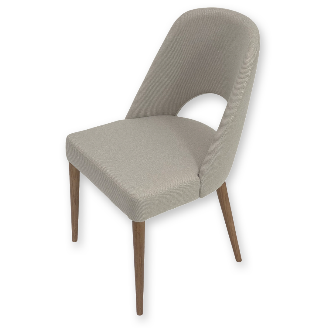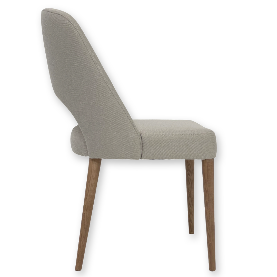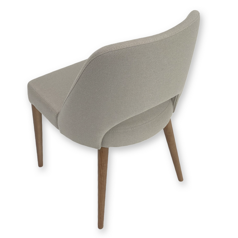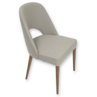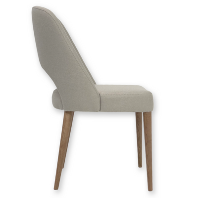 Cadeira Sónia estofada com estrutura em madeira. Pés em Madeira de Freixo Maciço com Velatura Nogueira.