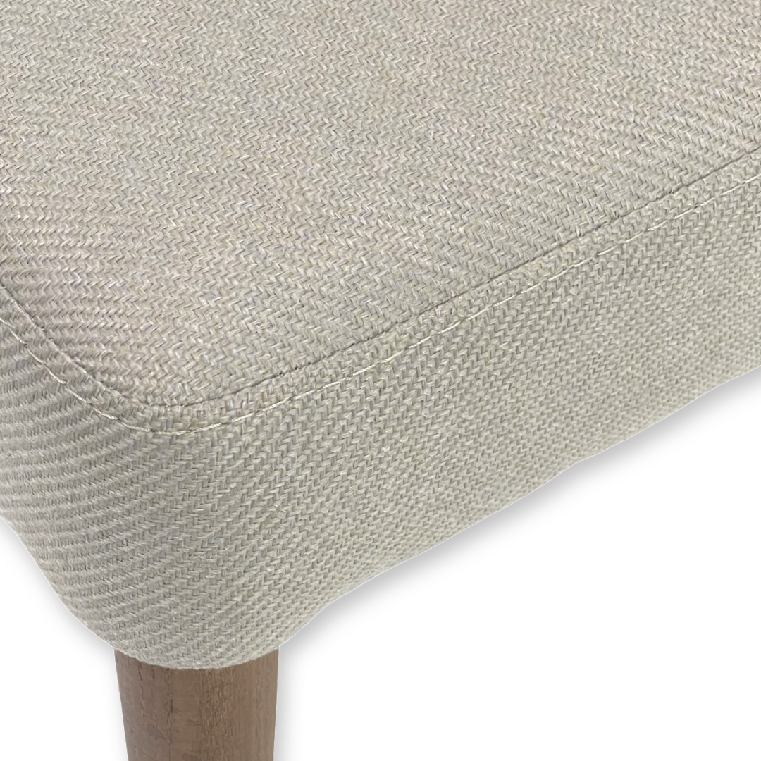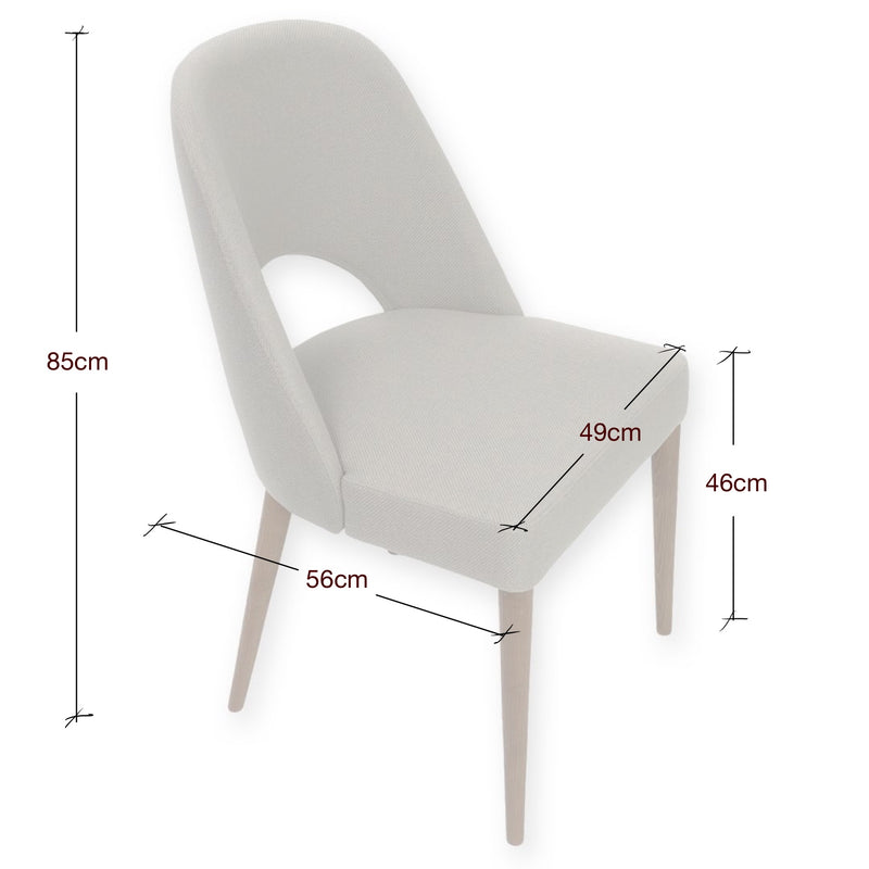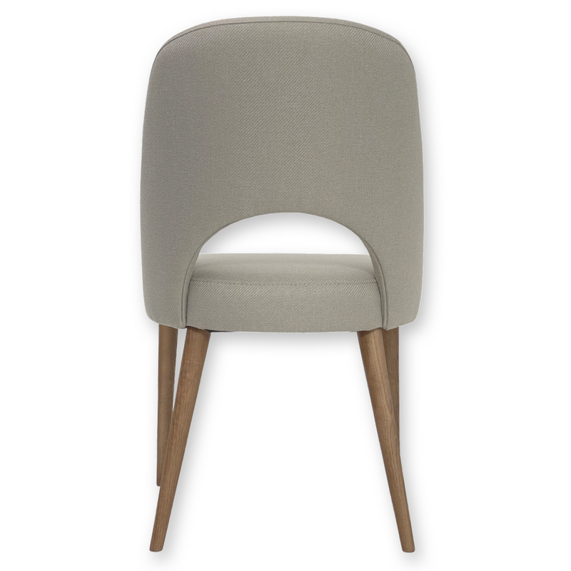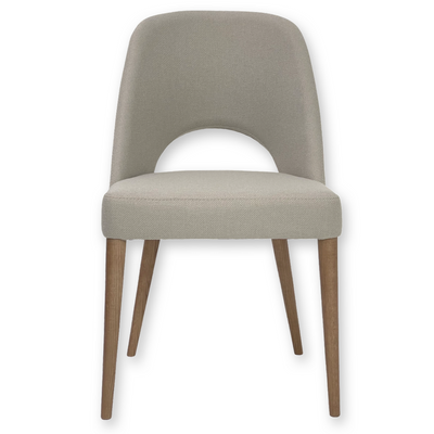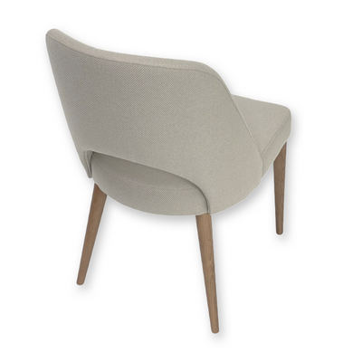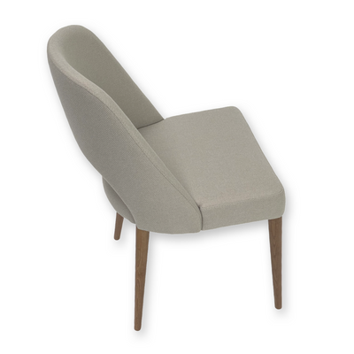 Cadeira Sónia estofada com estrutura em madeira. Pés em Madeira de Freixo Maciço com Velatura Nogueira.