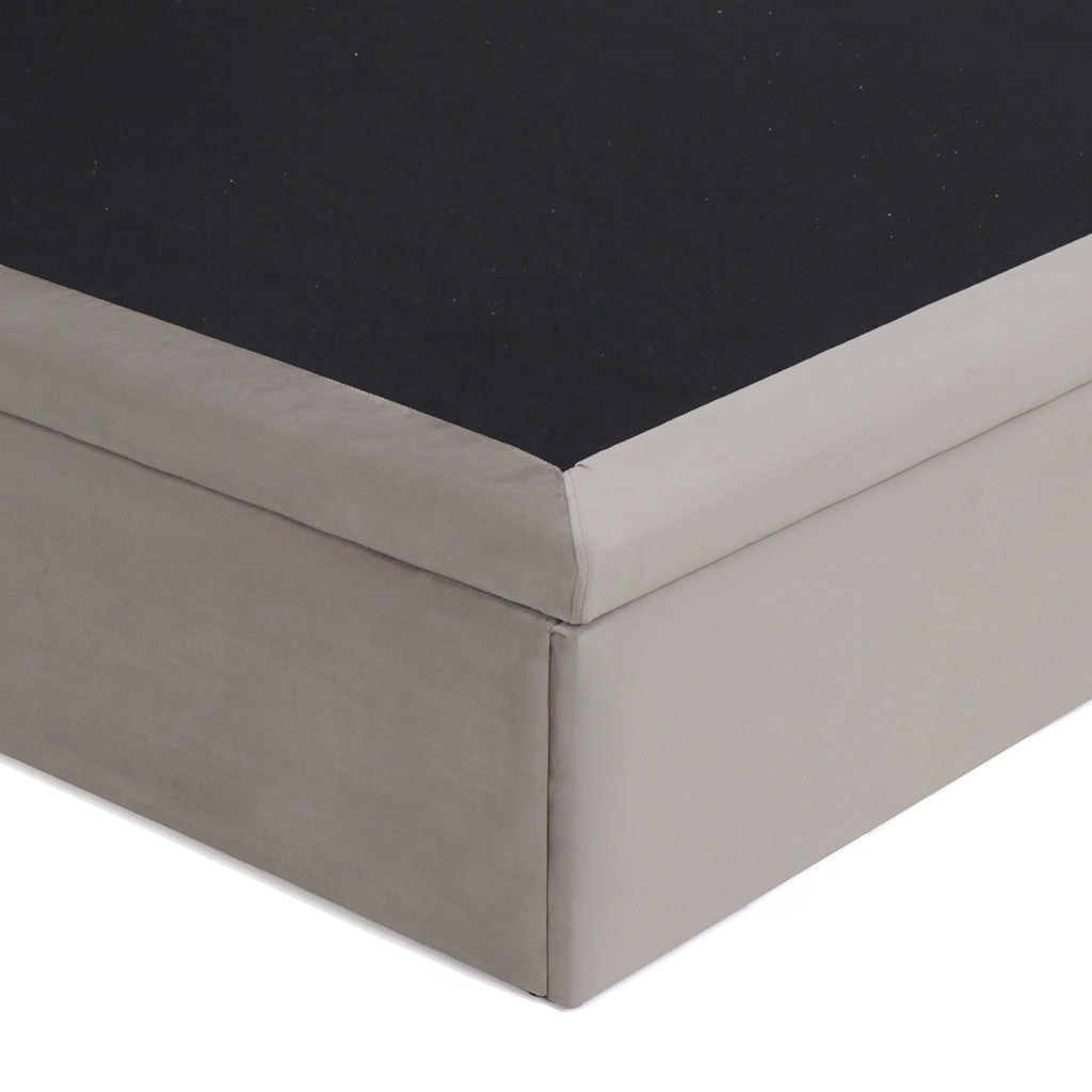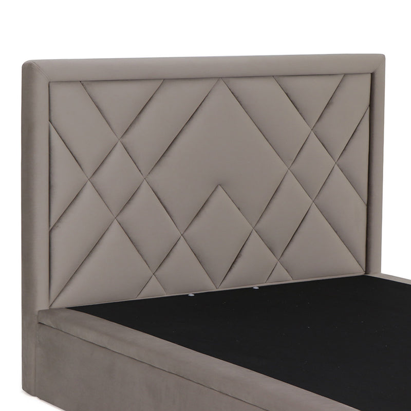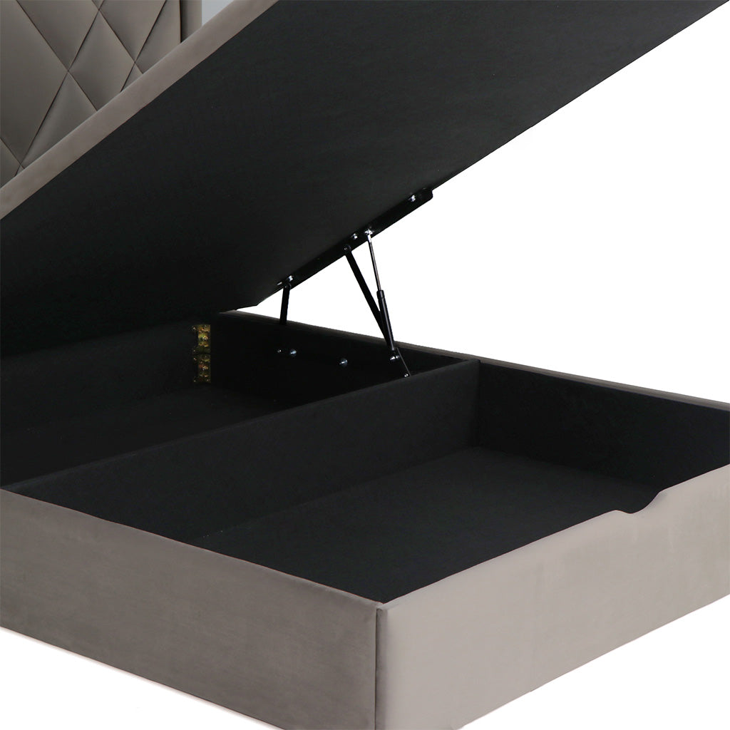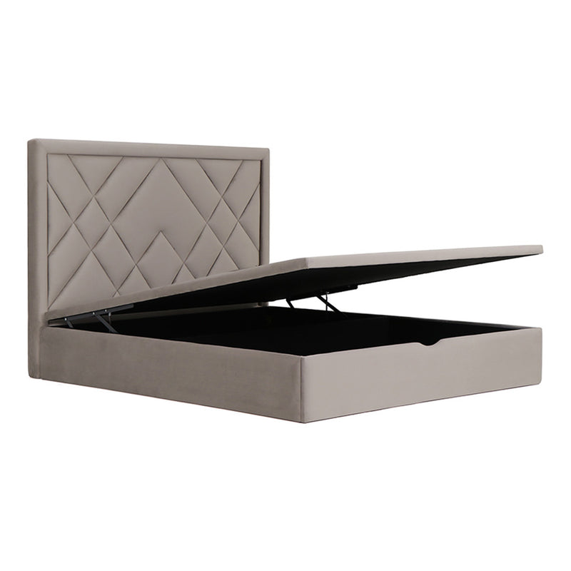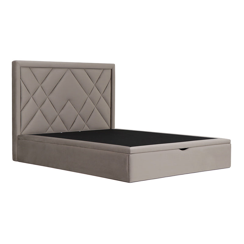 Camas com arrumação de tampo elevatório. Estrutura do sommier em aglomerado de madeira ultra-resistente, forrado a tecido no interior e tampo de estrado de ripas. Cabeceira em losangos geométricos. O sommier é dividido em 4 partes e o tampo é inteiro. Este produto apenas inclui a cama (sommier + cabeceiras).