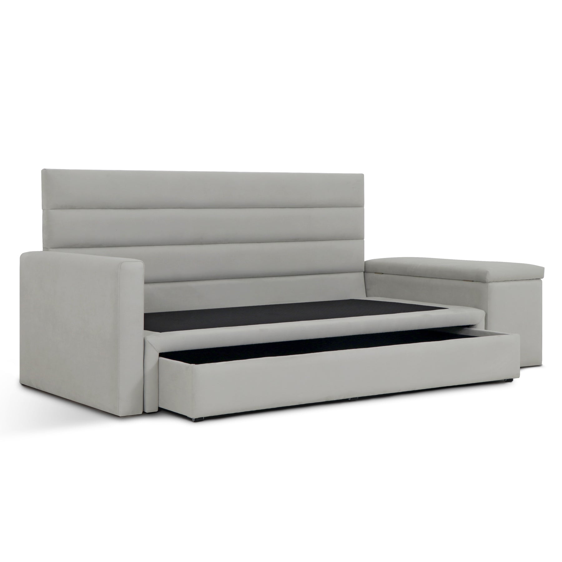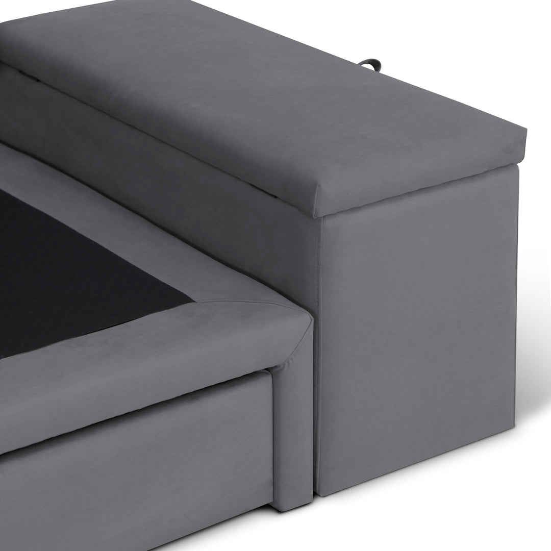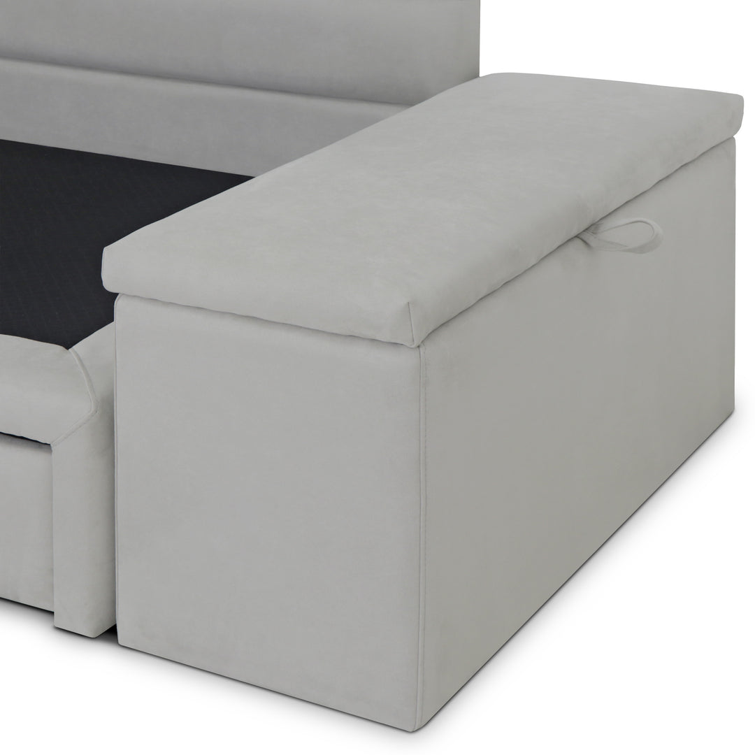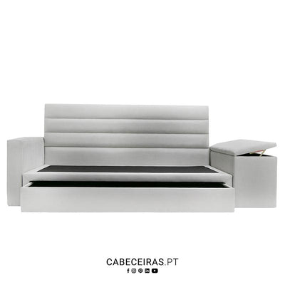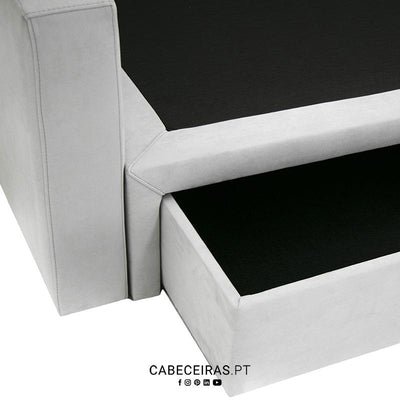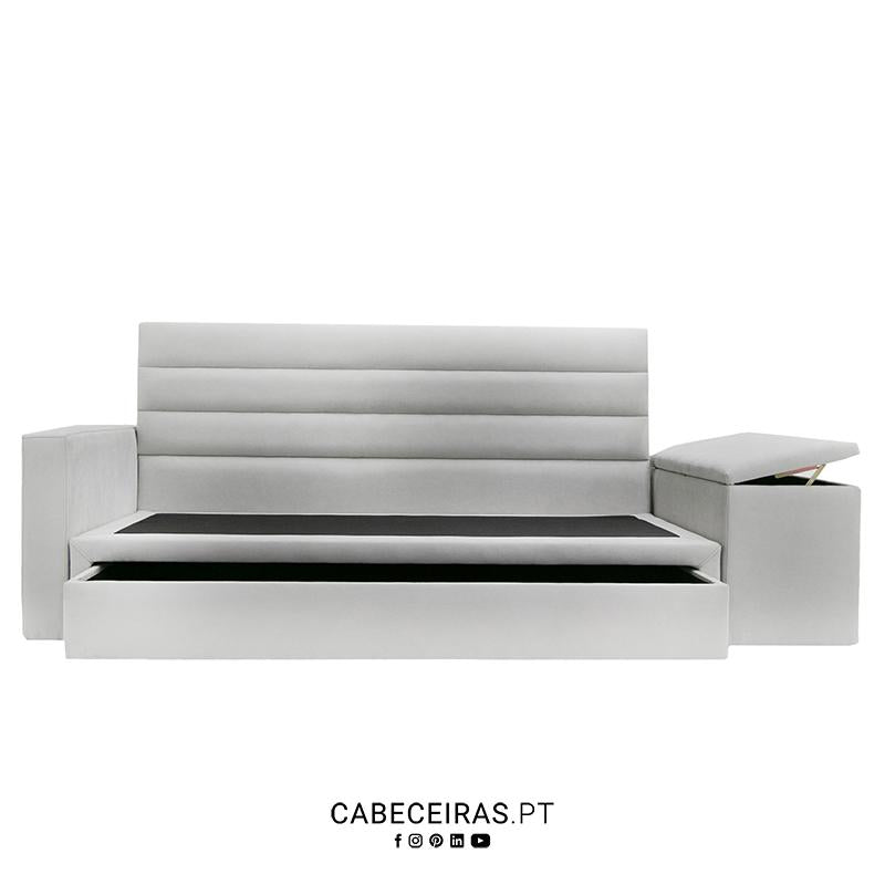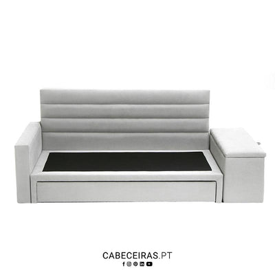 Cama com arrumação em gavetão e baú. Estrutura em contraplacado ultra-resistente e aglomerado de madeira. Gavetão com rodas inferiores para arrumação ou colchão extra. Medidas selecionadas correspondem ao tamanho do colchão. Medidas exteriores de 240cm x 100cm (aproximadamente). Cabeceira lateral com 63cm de altura, cabeceira de trás com 100cm de altura e baú lateral com 100cm x 40cm x 50cm (comprimento x largura x altura).