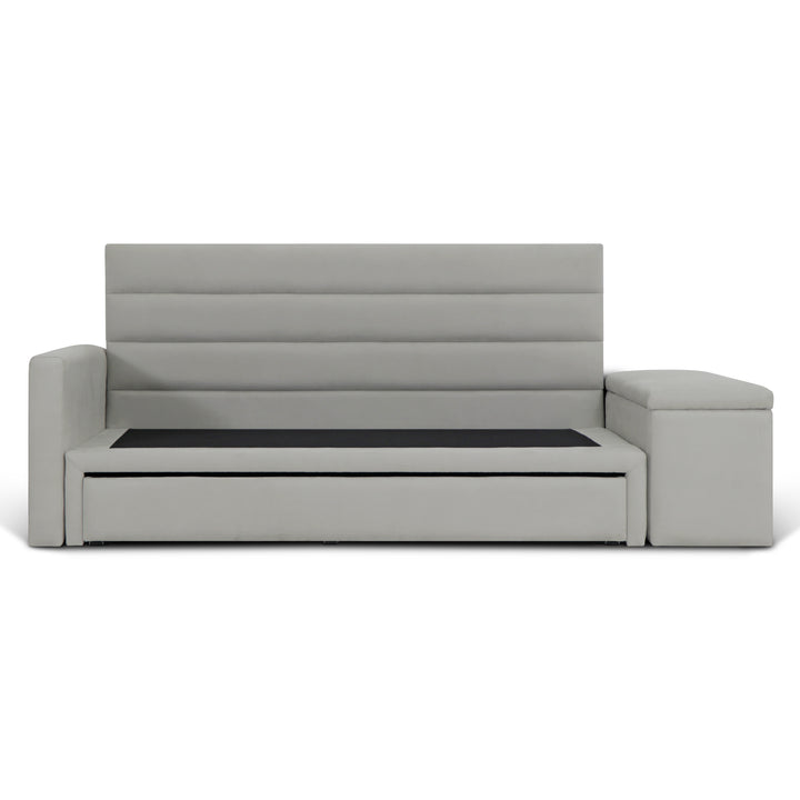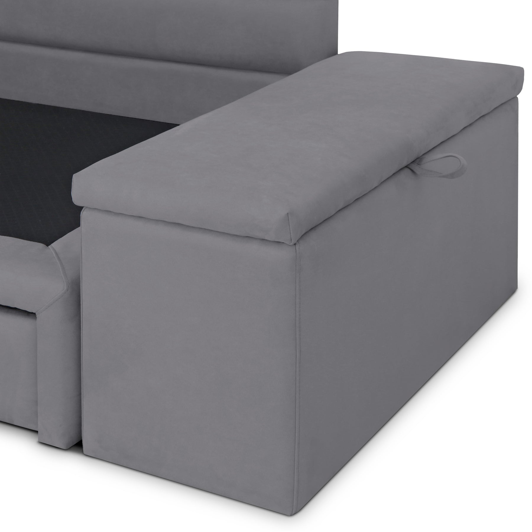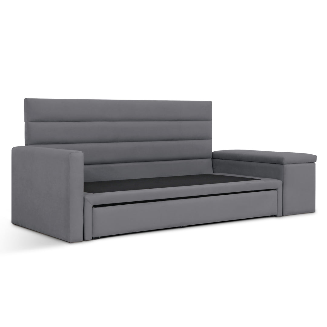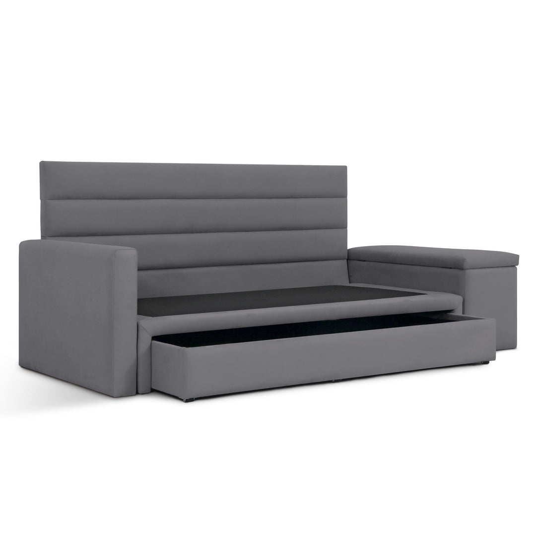 Cama com arrumação em gavetão e baú. Estrutura em contraplacado ultra-resistente e aglomerado de madeira. Gavetão com rodas inferiores para arrumação ou colchão extra. Medidas selecionadas correspondem ao tamanho do colchão. Medidas exteriores de 240cm x 100cm (aproximadamente). Cabeceira lateral com 63cm de altura, cabeceira de trás com 100cm de altura e baú lateral com 100cm x 40cm x 50cm (comprimento x largura x altura).