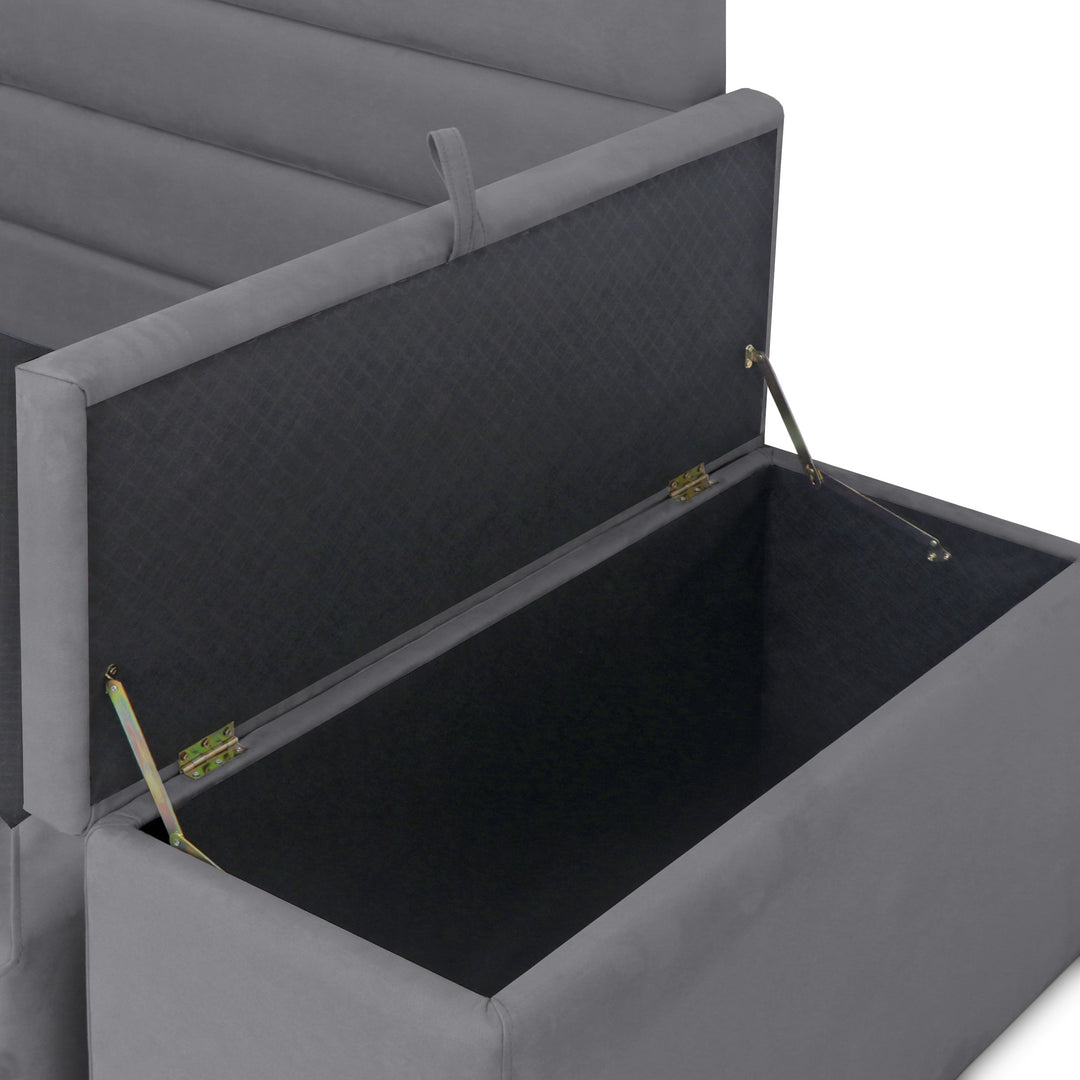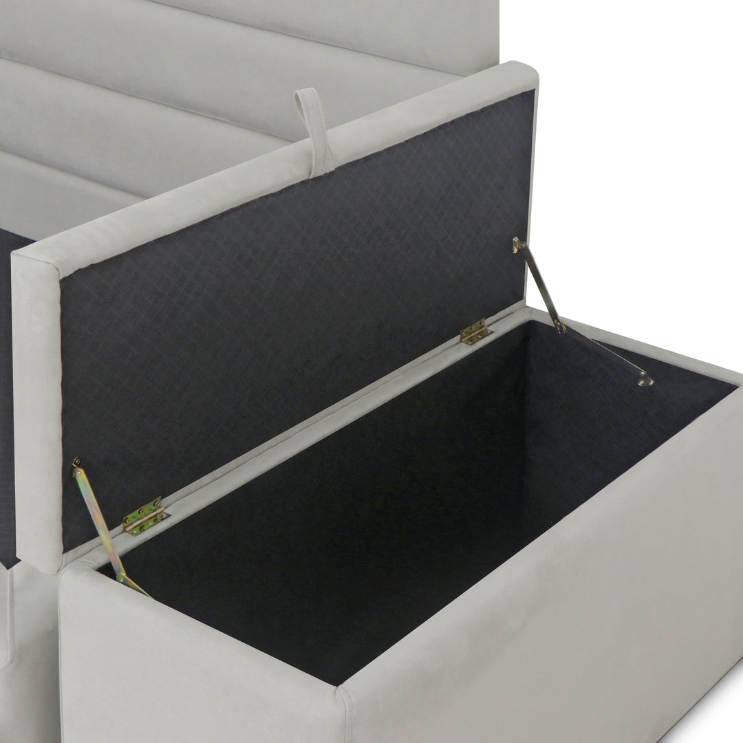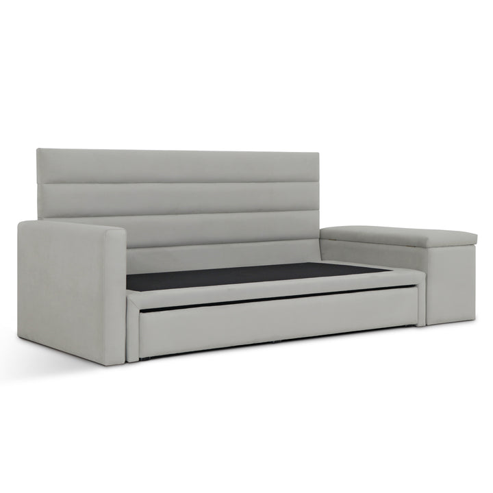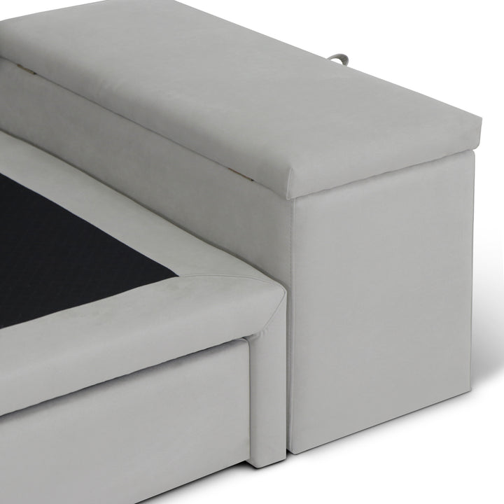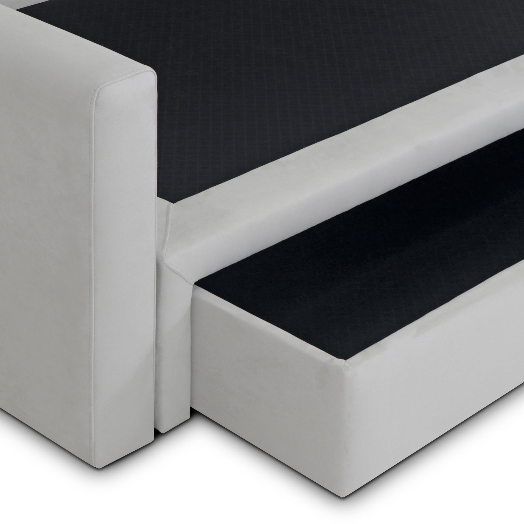 Cama com arrumação em gavetão e baú. Estrutura em contraplacado ultra-resistente e aglomerado de madeira. Gavetão com rodas inferiores para arrumação ou colchão extra. Medidas selecionadas correspondem ao tamanho do colchão. Medidas exteriores de 240cm x 100cm (aproximadamente). Cabeceira lateral com 63cm de altura, cabeceira de trás com 100cm de altura e baú lateral com 100cm x 40cm x 50cm (comprimento x largura x altura).