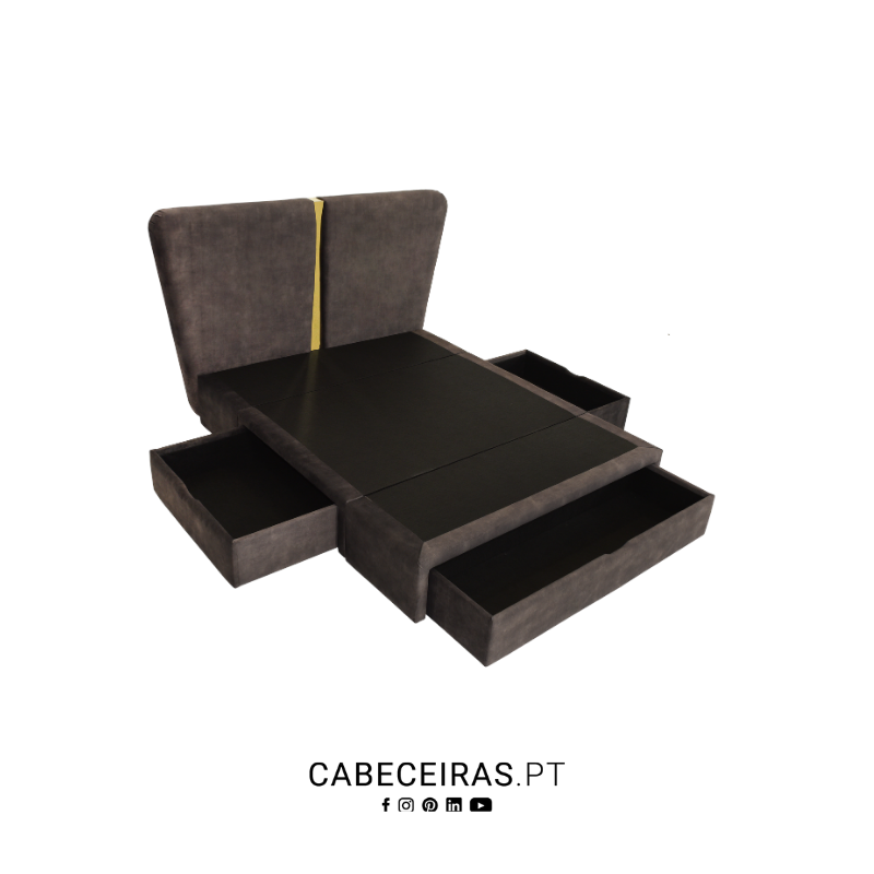 Cama com arrumação em 3 gavetas. Estrutura do sommier em contraplacado ultra-resistente e aglomerado de madeira. Cabeceira em aglomerado de madeira, espuma, tecido e metal dourado sem juntas. Espessura da cabeceira de 10cm (aproximadamente). O sommier é dividido em 3. Este produto apenas inclui a cama (sommier + cabeceira).